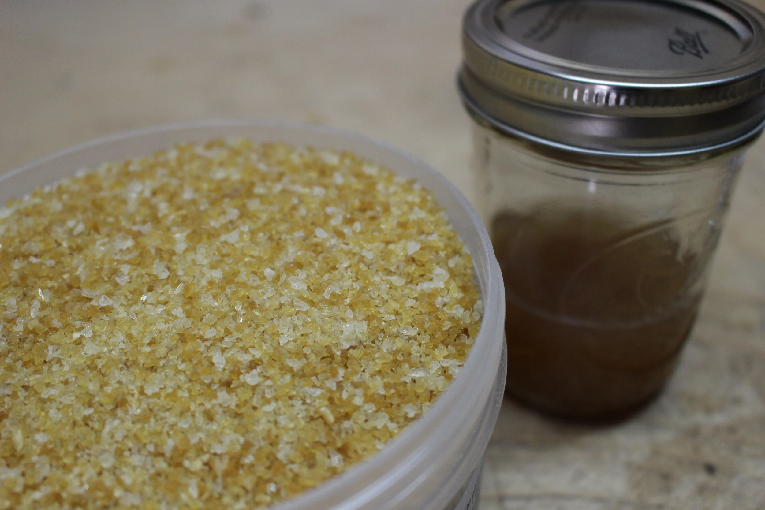 Measuring and mixing up a new batch of blonde and amber shellac for French polishing. I like to use one hundred ninety proof Everclear. It's a bit pricey, but it doesn't have the added chemicals that make your head hurt like denatured alcohol. Also mixing up some hide glue granules for gluing stuff.
